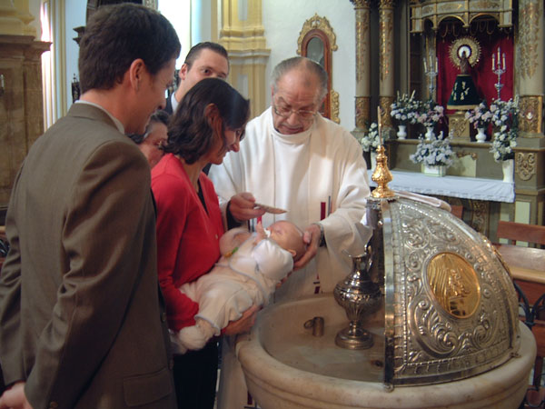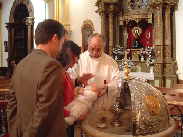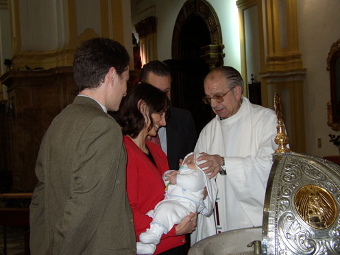 A lot to do for little Alvaro on his first trip to his 'other' home country: Spain. first time in Spain, first Christmas, first New Year's, first time at the beach, first sun bath, first smile, first time with baby sitter (Grandma).... and his Christening on Jan 11, 2003 in la Iglesia de Nuestra Señora de la Encarnación in Marbella, Málaga, where Marisa and I got married a little bit over 3 years ago. Like at our wedding Priest Don Francisco conducted the ceremony. 11 de Enero 2003 - Bautizo de ÁlvaroUn día esplendido con mucho sol y temperaturas al rededor de los 20 grados (o más en el sol). Una pequeña fiestacilla con dos otros parejas (unos de Bilbao, los otros de Málaga) en la Iglesia de Nuestra Señora de la Encarnación, Marbella, Málaga.